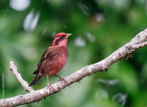 Dark-breasted rosefinch perched atop a green-leafed branch of a tree.