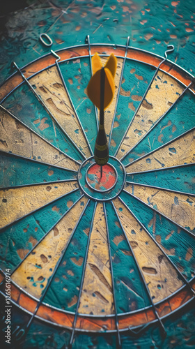 Dart hitting the bullseye on a target. Symbol of success, achievement, and accurate aim. Competition, sport, and goal setting. Close-up, detailed image.