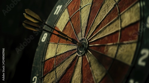 dart, bullseye, target, game, sport, competition, achievement, success, sharpened, accuracy, skill, strategy, aim, throw, play, fun, entertainment, pub, bar, leisure, activity, hobby, wooden, board, arrow, gold, tip, black, red, white, number, vintage, worn, closeup, dark, background, shadow, texture