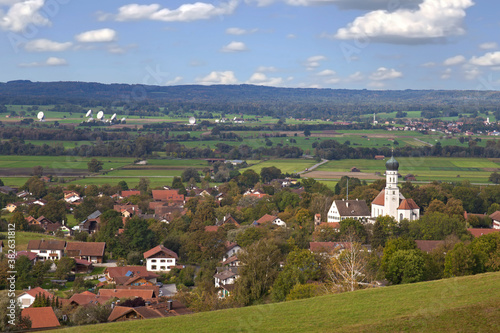 das Dorf Pähl in Oberbayern mit der Erdfunkstelle im Hintergrund