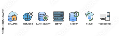 Data center banner web icon vector illustration concept with icon of database, network, data security, server, backup, cloud and technology