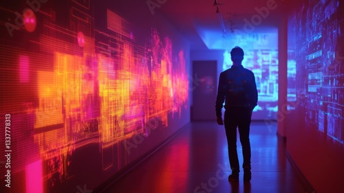 artificial, intelligence, future, technology, innovation, analysis, prediction, visualisation, datum, software, engineering, neon, glowing, futuristic, network, security, silhouette, person, walking, hallway, display, abstract, complex, system, information, cyberspace, learning, automation, computing, decision, solution, exploration, pattern, progress, potential, digital, modern, connection