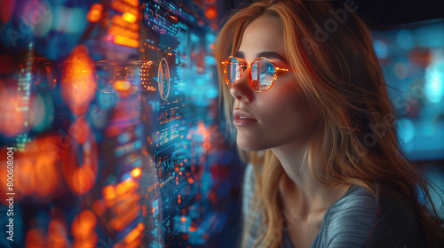 Data reflecting on eyeglasses on woman's face. Computrer programmer big data and ux designer concept