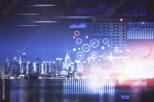 Data theme hologram drawing on city view with skyscrapers background multi exposure. Ai concept.