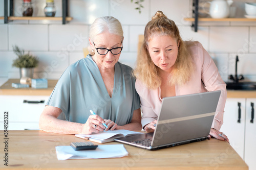 daughter helps her elderly mother figure it out online with her personal account. Woman teaching senior mother to use internet at home. Senior woman with her daughter looking at modern gadget indoors.