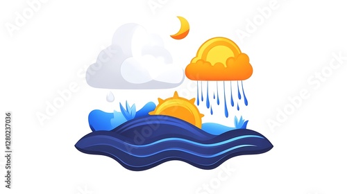 sun, moon, cloud, rain, water, wave, ocean, sky, weather, nature, day, night, climate, landscape, illustration, graphic, design, art, cartoon, colourful, sunshine, droplet, cloudburst, seasonal, environment, temperature