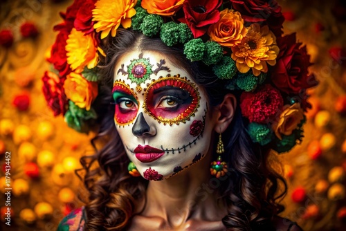Day of the Dead Sugar Skull Portrait, Festive Mexican Holiday Celebration