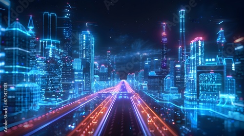 Dazzling Neon Lit Cityscape at Night with Towering Skyscrapers and Busy Traffic on the Roads