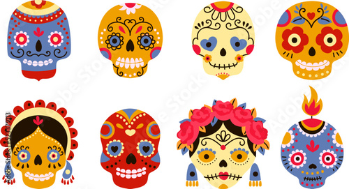 Dead day skulls. Sugar scary skull dia de los muertos. Mexico cartoon totem logo in hat and flower wreaths. Mexican festival nowaday spooky vector elements