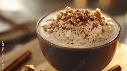 oatmeal, walnut, cocoa, bowl, cream, dessert, breakfast, cinnamon, healthy, food, delicious, morning, nourishment, diet, tasty, plate, sweet, closeup, organic, epicure, culinary, brown, cookery, ingredient, snack, crunchy, freshness, art, baked, nutty, vegan, grain, fiber, alimentary, rustic, wooden, table, soft, sharpened, background, still, life