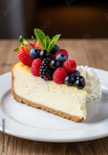 Decadent cheesecake slice topped with vibrant mixed berries and whipped cream