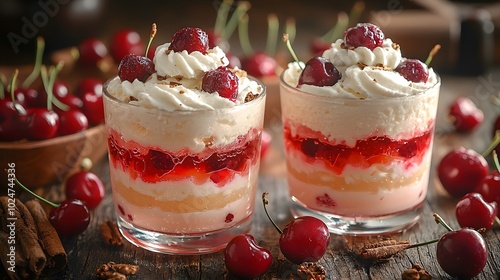 Decadent cherry parfaits with whipped cream and fresh cherries in glass cups