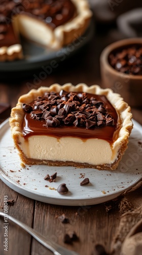 Decadent chocolate cream pie served on a rustic wooden table in a cozy kitchen setting