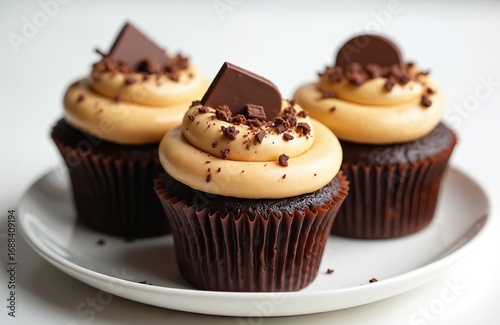Decadent chocolate cupcakes with creamy peanut butter frosting, chocolate chip toppings. Three rich baked goods sit on white plate, perfect for dessert lovers. Sweet treats offer indulgence, visual