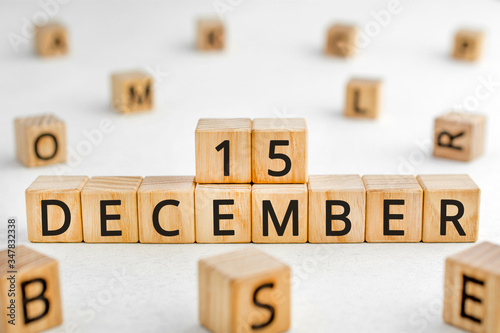 December 15 - from wooden blocks with letters, important date concept, white background random letters around