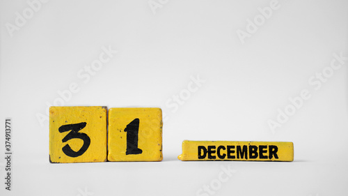 DECEMBER 31 Wooden calendar. The end of the year. White background with space for your text