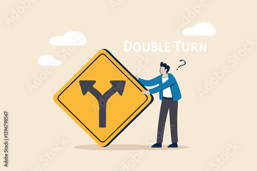 Decision to choose pathway, alternative or choice, deciding career path, determination or thinking to find solution concept, contemplation businessman thinking which way to go on folk road sign.