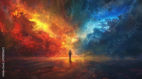 decision, choice, landscape, contrast, light, darkness, sky, emotion, struggle, person, vibrant, serene, internal, colourful, surreal, conflict, calmness, atmosphere, journey, exploration, uncertainty, destiny, option, symbolism, nature, thinking, pivotal, moment, inspiration, clarity, creativity, imagination, abstract, beauty, individuality, perspective, dreamlike, tension, harmony, movement, solitude, balance, transformation