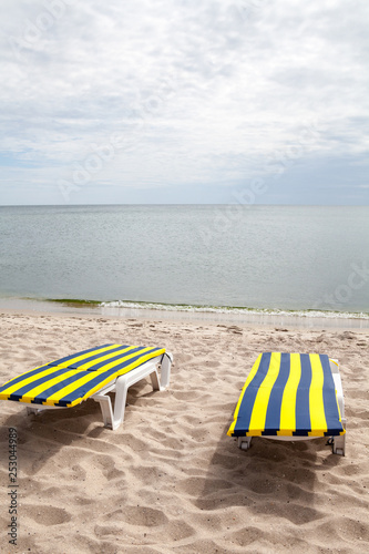 deck, chair, beach chair, bed, beach chair, lounge, beach, sand, sandy, empty, nobody, season, outdoors, leisure, day, furniture, object, vacation, relax, relaxation, resort, recreation, sea, ocean, shore, bank, coastline, coast, couple, summer, sun, blue, yellow, striped, new, enjoy, rest, shoreline, sunbath, tour tourism, trip, waterside, horizon, cloudy