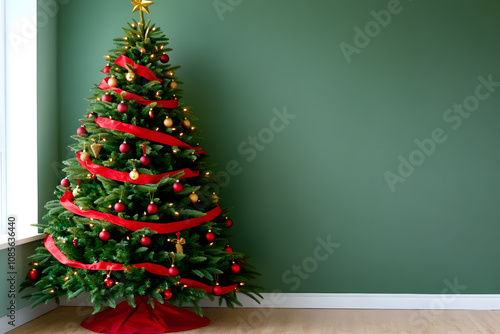 Decorated Christmas tree on green night background. Happy Holidays. Leave space for text.