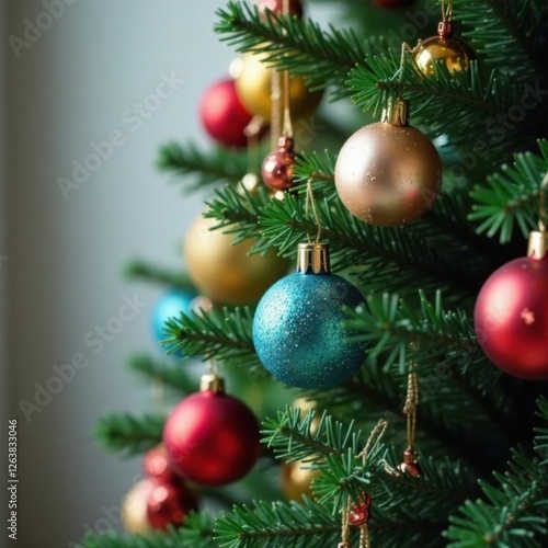 Decorated Christmas tree with colorful ornaments hanging from branches, Tinsel, Snowflake Ornaments