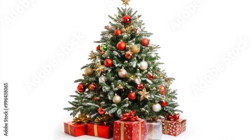 Decorated Christmas Tree with Gifts Underneath on White Background