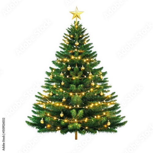christmas, tree, holiday, winter, decor, ornament, gold, light, illuminated, festive, celebration, season, christmas, pine, fir, evergreen, background, isolated, white, design, element, graphic, image, clip art, illustration, three-dimensional, rendering, star