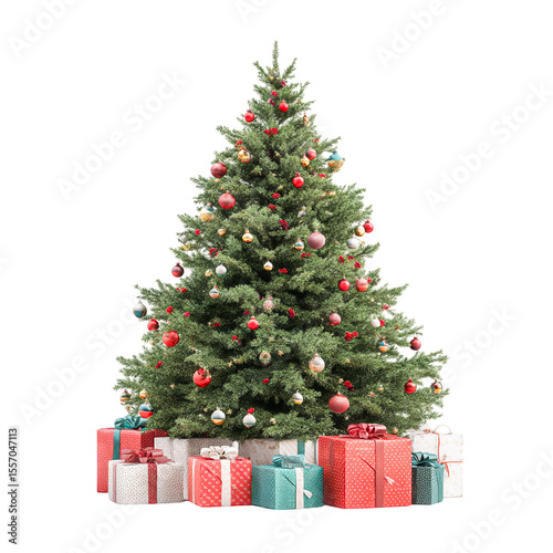 Decorated Christmas tree with presents underneath for festive season, isolated on transparent background, perfect cutout, PNG