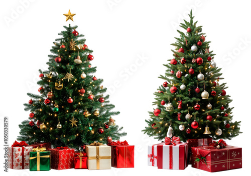 Decorated Christmas trees with gift boxes underneath, isolated on transparent background, PNG