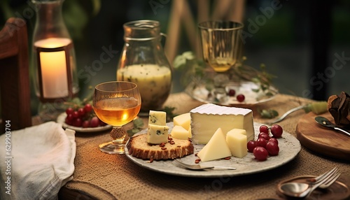 Decorated empty dining table with cheese plate, honey, and glass of drink
