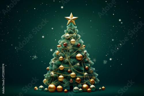 Decorated with ornaments and lights Christmas tree on dark green background. Merry Christmas and Happy Holidays greeting card, frame, banner. New Year. Noel. Winter holiday theme