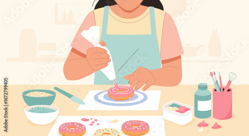 Decorating Donut: A Culinary Artist Adorning Dessert with Sweet Frosting and Sprinkles