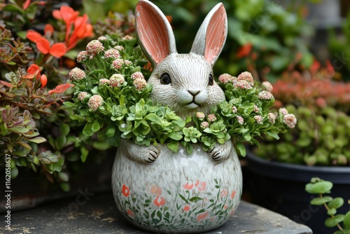 Decorative bunny planter filled with greenery in a vibrant garden setting during daylight