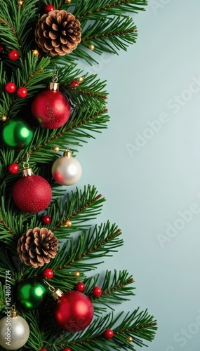 Decorative evergreen branches with red and green ornaments, pinecones, and berries, festive, Christmas decor, berries