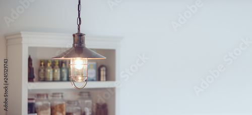 Decorative industrial style metal lamp hanging from the ceiling of a modern kitchen with white walls and shelves with healthy food in the background.
