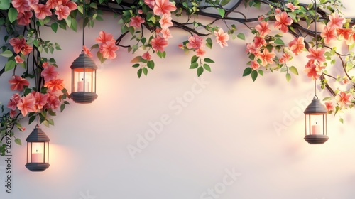 Decorative Lanterns with Pink Flowers on a Wall Background