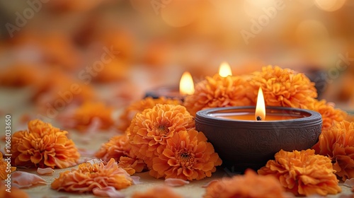 Decorative oil lamps and marigold flowers glowing on a yellow background, ideal for cultural festival greetings and holiday celebrations like Diwali.