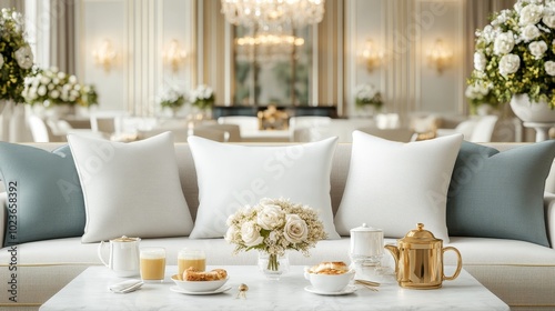 Decorative pillows with metallic accents in a glamorous setting, surrounded by luxury furniture, and chandeliers, 3D illustration