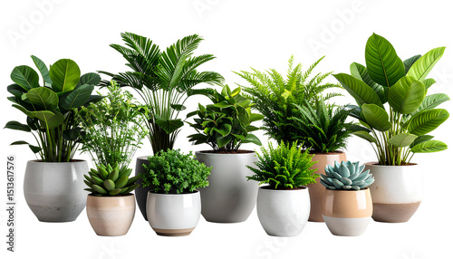 Decorative Potted Plant Set – Ceramic Containers and Green Foliage, Transparent Background