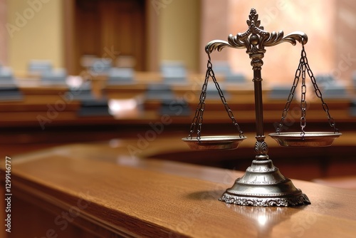 Decorative Scales of Justice in a Warm Courtroom Setting Representing Law and Fairness