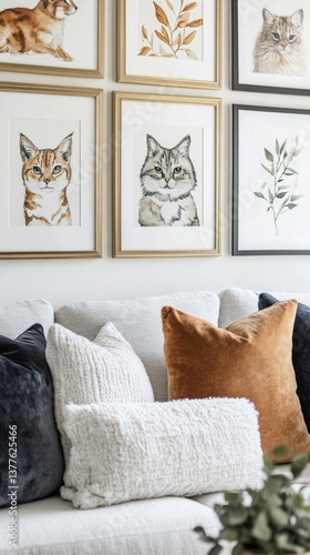 animal, portrait, cosy, couch, textured, pillow, home, interior, design, artwork, display, comfortable, seating, inviting, decor, furnishing, cat, illustration, stylish, arrangement, warm, atmosphere, styling, living, space, modern, wall, contemporary
