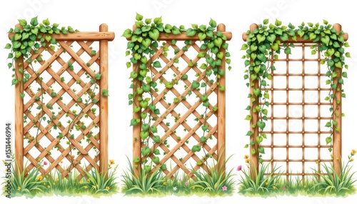 Decorative wooden trellises covered with green vines outdoor garden illustration natural setting close-up gardening concept