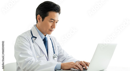 doctor, physician, male, asian, professional, health care, medicals, laptop, computer, working, typing, technology, stethoscope, labcoat, white coat, clinic, hospital, office, sharpened, concentration, datum, record, research, innovation, medical professional, diagnosis, prescription, medical practice