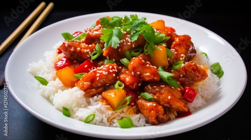 Deep and Delicious Sweet and Sour Pork on Rice - A Colourful Asian Dish with Carrots and Traditional Chinese Cookery