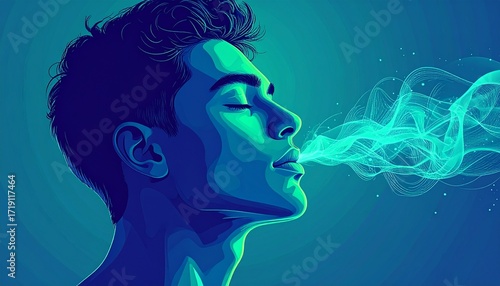 Deep Breathing Exercise. A conceptual illustration of a human head in profile. The figure has its eyes closed peacefully.