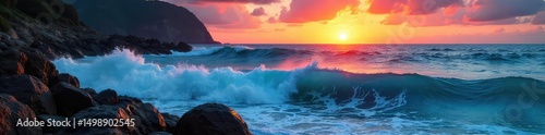 Deep, cerulean ocean waves crash against a rocky shore at sunset, the sky ablaze with vibrant hues The scene evokes a sense of timeless power and serene beauty , sky, landscape, powerful nature