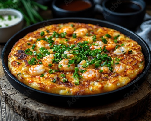 Deep Dish Shrimp Pizza, Golden Crust with Cheese and Herbs, Black Cast Iron Skillet, Wooden Background, Restaurant or Home Dining Setting, Ready to Serve