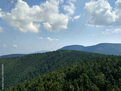 mountain, landscape, sky, nature, blue, green, mountain, forest, cloud, hill, view, cloud, tree, summer, panorama, travel, scenic, tree, vale, grass, day, countryside, beautiful, park