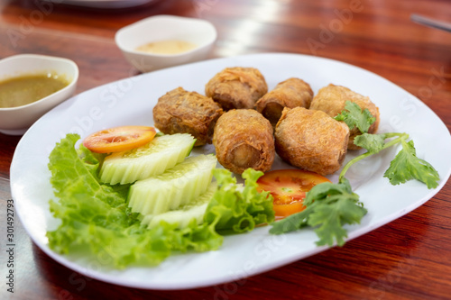 Deep Fried Crab meat roll or Hoi jo with sweet sauce on white plate , thai food, asian food, chinese food.