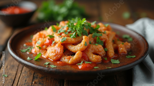 Deep fried Korean rice cake Tteokbokki with spicy sauce and greens on the plate